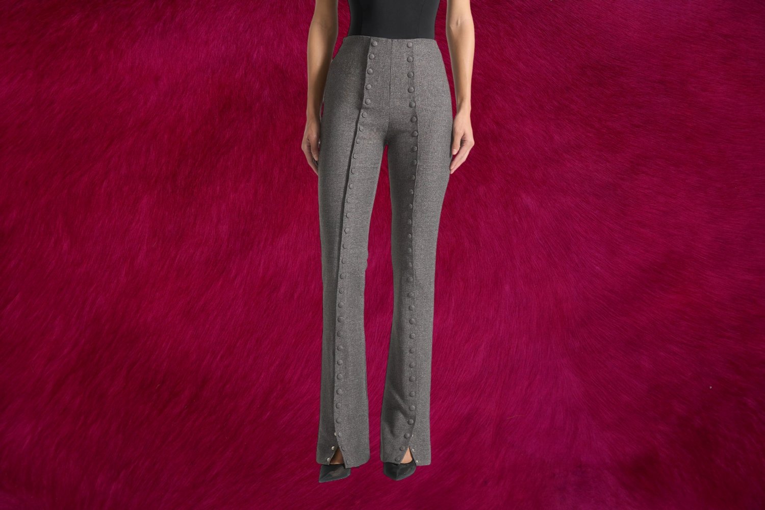 If you’re after a slightly more tailored option, Manière De Voir’s Therese Tailored Button Detail Trousers echo the equestrian tone of Burberry’s look. The dark grey shade and side button detailing mirror the small, polished finishes that make Lee’s designs stand out. At $165, they offer a high-fashion silhouette with an approachable price tag.